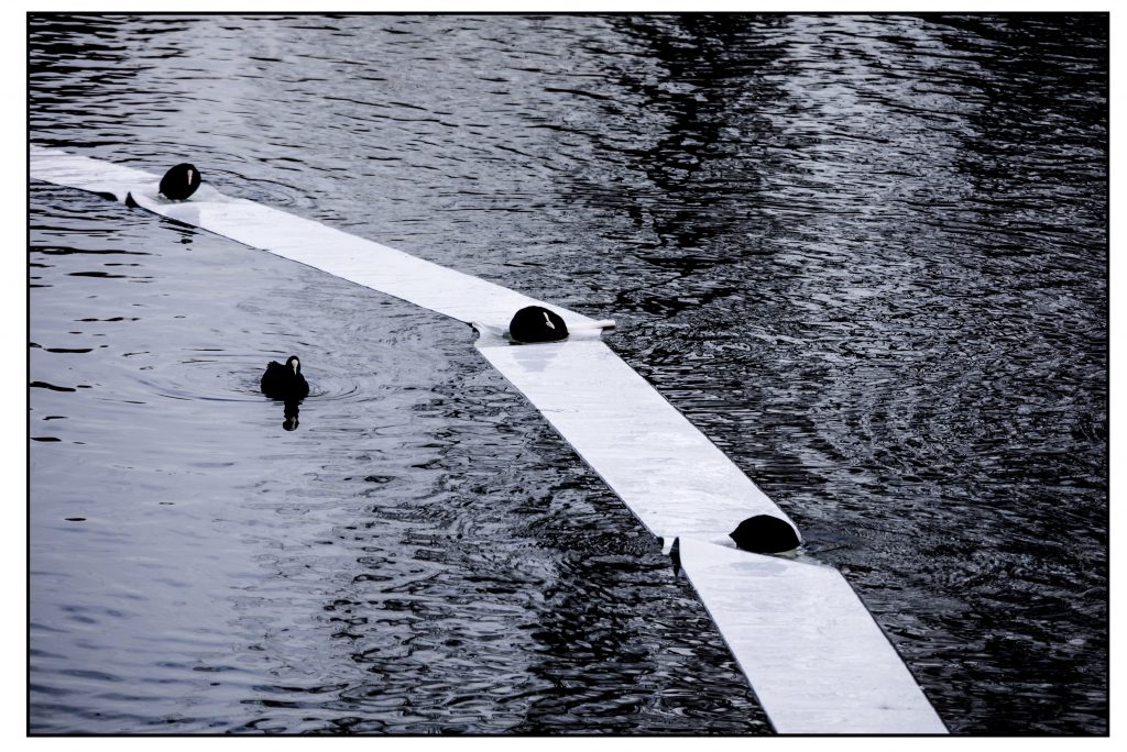 (Jetzt auch richtig geschrieben: Blässhühner, mit „ä“) Das Absperrband auf dem Kermisdahl, von der Feuerwehr nach einer ölhaltigen Einleitung verlegt, dient den dort ansässigen Blässhühnern zum fröhlichen (?) Spiel – aber zu welchem? Räuber und Gendarm? Reise nach Jerusalem? Warum sind ausgerechnet die Knickpositionen besetzt? Wird das einzelne Exemplar links beaufsichtigt oder gefangen gehalten? Wie immer: Die Natur stellt Fragen, gibt aber keine Antworten. So sad! Will lose bigly.